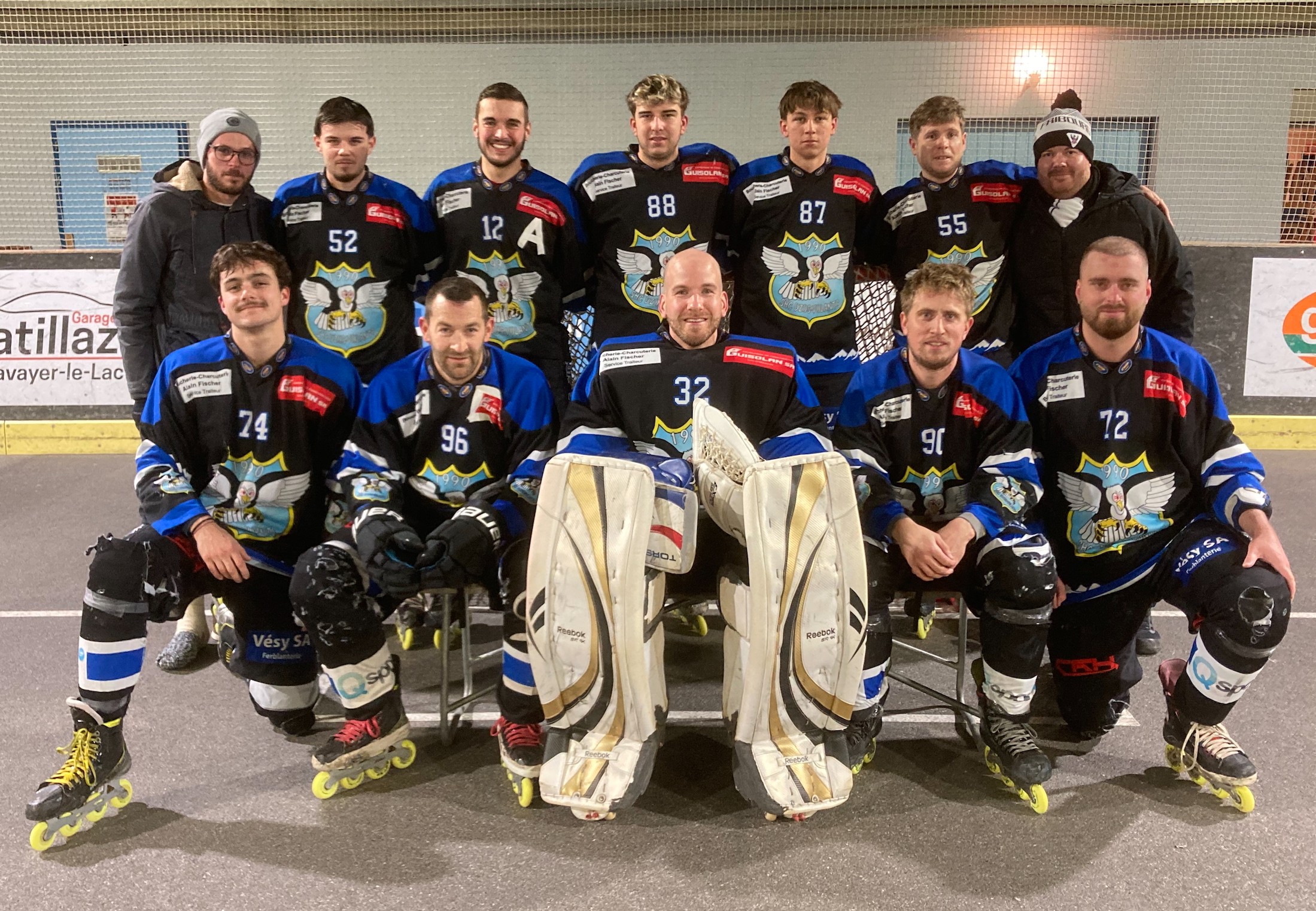Derrière de gauche à droite : Maxime Ayer, Dylan Sottaz, Léandro Salvi, Loris Berger, Thomas Romanens, Denis Roulin et Robin Marmy (coach).