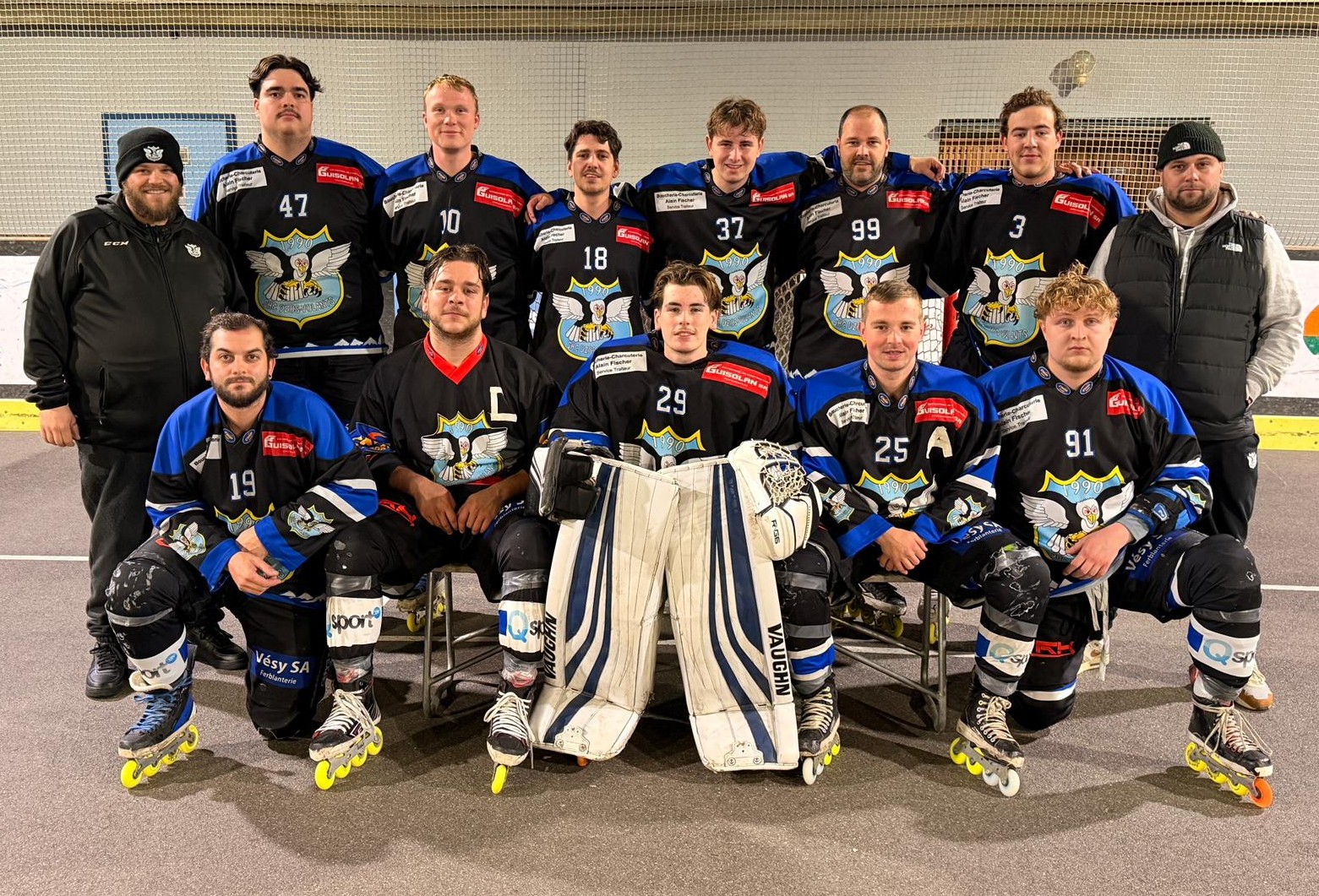 Derrière de gauche à droite : Marco Cetrangolo (coach), Hugo Villadoniga, Guillaume Givel, Maxim Duc, Loïc Chassot, Marc Sanchez, Nolhan Berger et Kevin Niederhauser.